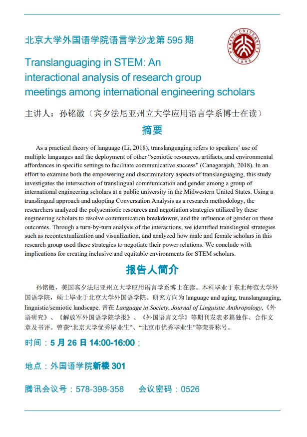 服务导航 华体网语言学沙龙第595期:Translanguaging in STEM:An interactional analysis if research group meetings among international engineering scholars 2023-05-21