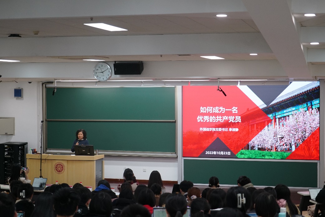 李淑静以身边人和身边事为例,向同学们讲述了北京大学优秀党员的先进事迹。从革命先烈李大钊到时代楷模樊锦诗、屠呦呦等杰出校友,近到我们身边的外院人,处处都闪烁着共产党员的精神光辉。仲跻昆先生在翻译和教育领域兢兢业业,为党和国家奉献一生;外院多语种翻译团队结合自身专业特长,为全球战疫事业贡献力量;朱睿智不顾疫情风险,投入到非洲难民营的救助工作中,把青春奉献给人类命运共同体的崇高事业。李淑静勉励同学们学习榜样精神,在实践中增长本领,在艰苦奋斗中砥砺自我。
