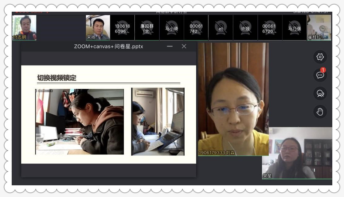 大学英语教研室和研公英教研室的几位老师交流了组织全校公共英语课程在线教学的体会。马小琦老师介绍了大英教研室外教的远程授课情况。特殊时期,许多外教身处国外,克服时差和技术的困难,通过Canvas、微信群、邮件等各种途径兢兢业业地授课、辅导,此外还随时与学生分享图片、视频,介绍所在国风土人情和文化习俗,可谓意外收获。许娅老师分享了她收集的学生对线上教学方式和考核方式的意见反馈。王爱华老师讲述了她使用Zoom直播平台授课的心得。