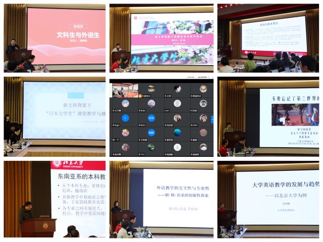 研讨环节,英语系高峰枫老师以“文科生与外语生”为主题,以新文科建设宣言为引子,探讨了北京大学外国语学科的人文属性及外语专业学生身份定位的问题,提出北京大学外语专业的学生应该首先是北京大学的文科生,其次才是外语专业的学生;外语专业的教师应该明确把所教学科当作文科学科看待,要把传统意义上认为的语言基础课努力打造成具有学术内容、学术思想的课程,真正称得上综合性大学文科课程的课程,而不是语言培训学校的课程。德语系胡蔚老师以“新文科背景下德语系本科教学与创新”为主题,介绍了新文科背景下德语系本科复合型专业课程的设置及跨学科人才培养的情况。德语专业采取了一系列措施阶梯提升高年级本科生科研能力、全面培养学生的国际能力,本科教学成果斐然。俄语系陈松岩老师着重介绍了多语种卓越人才实验班教学与教学改革情况,针对卓越班开展过程中出现的一些问题提出了本科专业教改的几点思考,包括根据学生实际情况开展教学、丰富教学内容和手段、优化考核标准等。卓越班的经验告诉我们,明确的学习目的和强烈的学习动机是搞好学习的根本基础;端正的学习态度和良好的学习能力是搞好学习的有力保证;灵活的组织安排可以有效提高学生的学习兴趣;一定的难度设计可以激发学生的挑战精神;适当的鼓励可以增强学生的自信心。日语系翁家慧老师以《日本文学史》课程为例介绍了新文科背景下的日语系课程建设,她聚焦课程建设中的学生、学术、学科三特点,并分享了日语系为学生提供资源检索平台、协调学科建设与课程设置等方面的经验。西葡语系于施洋老师分享了关于新发展阶段北京大学西班牙语本科教学价值取向的思考,提出了目前社会上在认识拉美国家的问题上存在的误区,建议本科外语教学应立足中国语境,以正确情感态度价值观为导向,同时也呼吁为学生创造更多语言对象国实地考察的机会。东南亚系史阳老师介绍了东南亚系以本科教学与思政教育结合为指导思想,找到所学外语特点、对象国国情与思政教育的结合点,引领学生将个人学习发展与时代发展结合。比如在教学语料选择中有机地引入对象国时政、中外交流内容,在中外对比中认识彼此在意识形态、社会文化上的差异,切身体会新时代的中国特色大国外交;在教材编写、教学内容中,注意我国与东南亚国家在一些重大问题上的不同立场,辨析对方的历史叙事、文学表述,掌握符合我方立场的地图、数据、语汇等,知己知彼,讲好中国故事。朝韩语系李婷婷老师以“外语教学的专业性和交叉性——基于朝韩语系的创新探索”为主题,分享了朝韩语系在协同教学、网络课程及第二课堂方面取得的成果及经验。大学英语教研室马乃强老师结合最新发布的《大学英语教学指南(2020版)》探讨大学英语教学的发展与趋势,分享了大英教研室实行弹性学分制,进行分级别、模块化教学的课程设置,介绍了大学英语教师在教学改革、教材编写、慕课建设等方面的发展成果,讨论了下一阶段大学英语课程思政建设、信息技术和人工智能技术应用以及国家级一流本科课程建设与申报等方面的工作和任务。