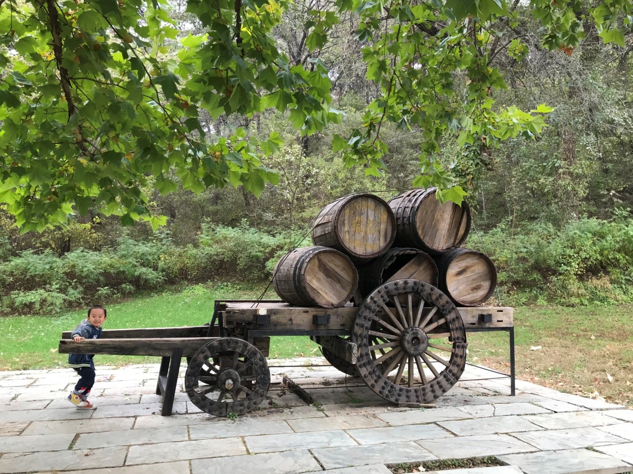 在酒庄带有张裕注册商标----双麒麟标志的北大门拍完合影后,我们由讲解员带领,沿着张裕路开始了我们的参观活动。此路仿照法国小城镇的马蹄石路修建,与两旁的法桐树相互辉映,形成了浓浓的浪漫情调。张裕路沿途展示了一些古老的酿酒、储酒等工具,如下图这辆运输马车。