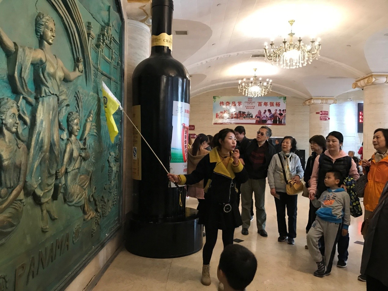 进入主楼城堡一层大厅,一幅浮雕映入眼帘。据介绍,它是以1915年张裕公司在巴拿马太平洋万国博览会上荣获的优质奖状为背景设计的。在这幅浮雕的正中央,是三位美丽的女子。一位手持工具,象征春天里的辛勤种植,另一位手捧竹篮,代表秋天里丰收的喜悦。中间站着的那位,手持两袋分别来自太平洋和大西洋的泥土,象征着历经1904年到1915年巴拿马运河的开凿历程,终于换来了大洋两岸的神圣同盟,也预示着中国葡萄酒文化与世界文化的交融。右方是距今已经有一百多年历史的张裕公司烟台总部的老门头,左边是闻名中外的烟台张裕百年地下大酒窖的场景。该酒窖始建于1894年,占地面积2666平方米,低于海平面7米,距离海边不足100米,至今不渗不漏,依然在使用中,被誉为“亚洲奇观”,更成为世界建筑史上的奇迹。浮雕上方是烟台山的灯塔,是烟台的标志性建筑,也寓意着张裕公司是中国葡萄酒行业的领航者。