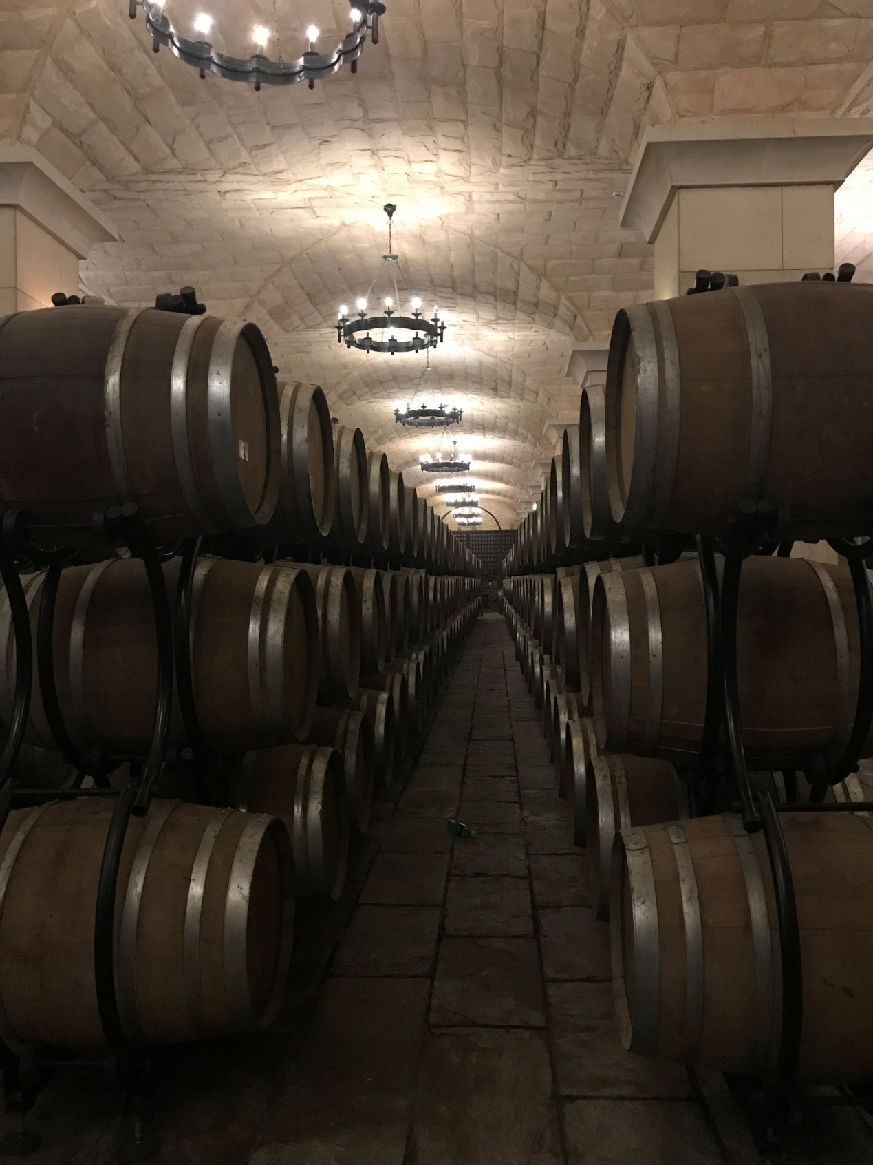 听完讲解,我们跟随讲解员沿着木质通道进入地下大酒窖。地下酒窖的总占地面积为2550平方米,常年恒温、恒湿,温度为14-16度,湿度为70%-75%,是目前国内最现代化的酒窖之一。酒窖内现共储存了1066只橡木桶,每只橡木桶的容积为225升,可以灌装750ml的葡萄酒300瓶。如此规模宏大的酒窖令人叹为观止。