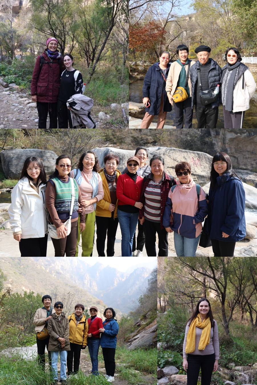 进入景区后,老师们沿着雁栖河畔的步道结伴而行,开始了约两小时的徒步游览。神堂峪“两山夹一沟”的地貌特色鲜明,清澈的河水在谷底缓缓流淌,两岸的山峦在秋日阳光的照射下色彩斑斓,构成了一幅美丽的自然画卷。老师们三五成群,一边欣赏着沿途的山坡石瀑、碧绿龙潭等美景,一边畅谈工作与生活,气氛轻松而热烈。平日里忙于教学和科研的大家,在此刻有了更多深入交流的机会,进一步拉近了彼此的距离,山谷中不时传来阵阵欢声笑语。