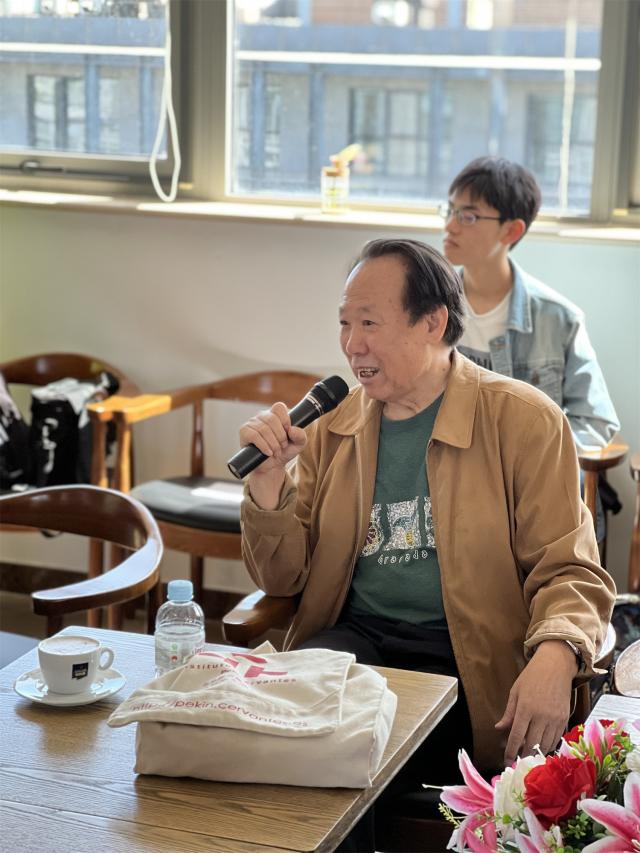 随后,在华体网咖啡书苑,赵振江老师与师生们座谈,分享自己的翻译生涯与感悟。他说这是一个难得的机会,让他能对自己的翻译生涯做一个简单的梳理和回顾。现场放映的一张张图片承载着宝贵的回忆,赵老师生动地讲述了七十年代末八十年代初在墨西哥进修的生活、八十年代末在西班牙格拉纳达大学翻译《红楼梦》时艰苦的工作,以及1995年获得智利鲁文·达里奥“蓝色百年”奖时独特的经历等。赵老师回忆道,为翻译《红楼梦》,他和两位西班牙译者加班加点工作,甚至连周末和圣诞节都没有休息。他翻译阿根廷高乔史诗《马丁·菲耶罗》是纯粹出于兴趣,出于对诗歌的热爱,并未考虑过刊印发行。在时代风云中,它的出版成为了文化外交大事,促进了中阿两国人民相互了解和交流。有阿根廷出版社为赵振江教授印制了《马丁·菲耶罗》专属版。世上仅此一本,独一无二。赵老师娓娓道来,幽默风趣,在座师生如沐春风,不时发出会心的笑声。