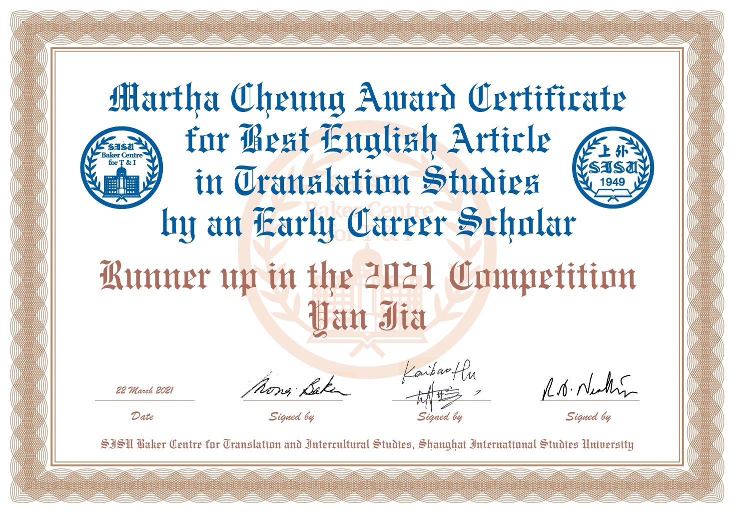 贾岩及其所获“张佩瑶奖”(译介学青年学者最佳英文论文竞赛第二名)
