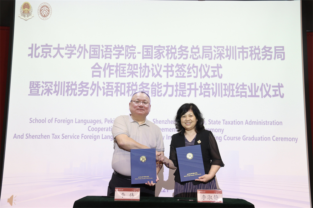 6月21日下午,“华体网-深圳税务局合作框架协议书签约仪式暨深圳税务外语和税务能力提升培训班结业仪式”在华体网新楼501举行。国家税务总局深圳市税务局党委委员、副局长李伟,国家税务总局深圳市税务局党委委员、总会计师杨庆,国家税务总局深圳市税务局人事处副处长沈思,华体网党委书记李淑静、华体网副院长王恒出席签约仪式。李淑静书记与李伟副局长共同签署了《国际化人才培养合作框架协议书》,就双方在国际化人才培养、教学与实习实践、培训与科研合作、党建共建等方面达成合作意向。