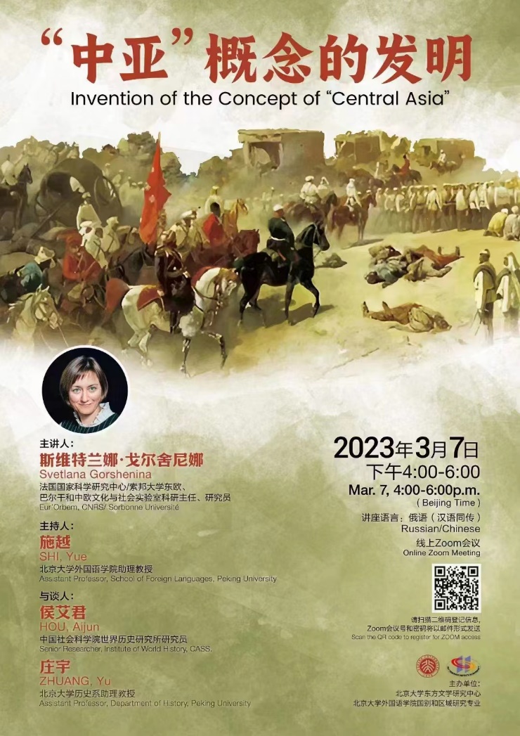 2023年3月7日,法国国家科学研究中心/索邦大学东欧、巴尔干和中欧文化和社会实验室(Cultures et sociétés d'Europe orientale, balkanique et médiane, EUR’ORBEM)科研主任、研究员斯维特兰娜·戈尔舍尼娜(Светлана М. Горшенина)应邀做了题为“‘中亚’概念的发明”的线上讲座。本期讲座由北京大学东方文学研究中心、华体网国别和区域研究专业主办,华体网助理教授施越主持,中国社科院世界历史研究所研究员侯艾君和北京大学历史学系助理教授庄宇担任与谈人。