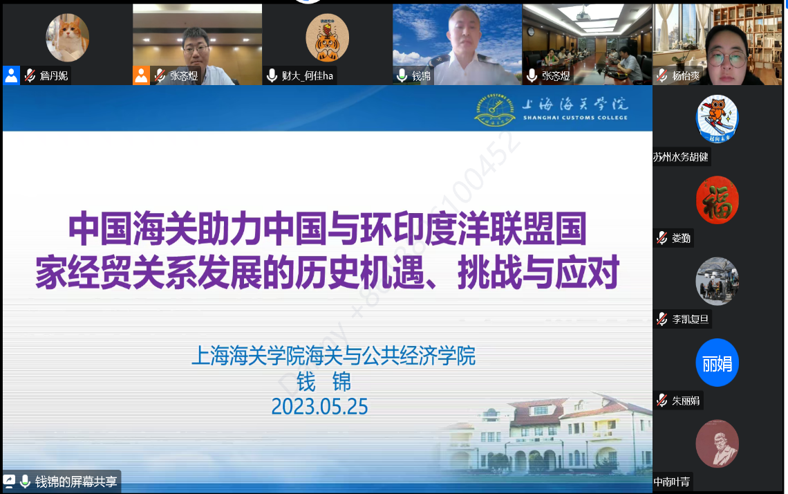 2023年5月25日,上海海关学院副教授钱锦应邀为我院师生进行题为“中国海关助力中国与环印度洋联盟国家经贸关系发展的历史机遇、挑战与应对”的讲座。本次讲座是“当代中国与印度洋地区”系列讲座的第二讲,由华体网国别和区域研究专业、亚非系和东南亚系主办,华体网张忞煜助理教授主持,云南财经大学印度洋地区研究中心杨怡爽教授、北大外院程莹助理教授和谢侃侃助理教授参与讨论。本次讲座在外院新楼B134会议室和线上平台同步举行,来自各高校的近百名师生在线参与讲座。