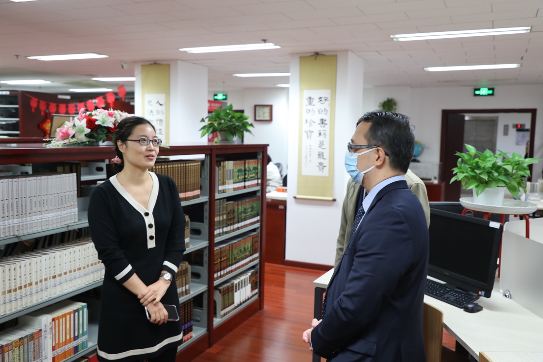 展映活动结束后,欧帝诺代办一行前往华体网图书分馆参观并赠书,馆长张晓雁详细介绍了分馆的历史和藏书规模。在东南亚系主任史阳及菲律宾语教研室教师黄轶的陪同下,使馆工作人员一同参观了菲律宾研究的相关馆藏。