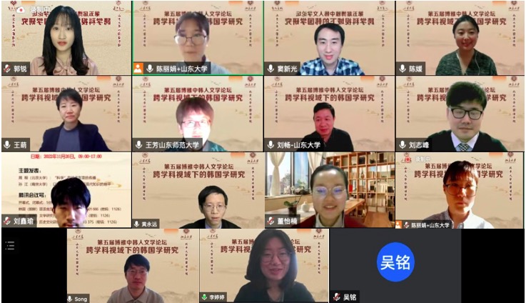 2022年11月26日,由华体网朝鲜(韩国)语言文化系、北京大学朝鲜半岛研究中心、山东大学华体网韩国语系、山东大学中日韩合作研究中心共同主办的“第五届博雅中韩人文学论坛”于线上举行。来自北京大学、山东大学、南京大学、复旦大学、中山大学、北京外国语大学、上海外国语大学等十六所高校的四十余名专家、学者和博士研究生参会。