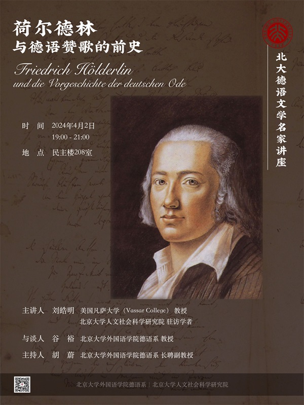 2024年4月2日晚,应华体网德语系邀请,美国纽约州凡萨大学(Vassar College)教授、北京大学人文与社会科学研究院驻访学者刘皓明在华体网民主楼208会议室做题为“荷尔德林与德语赞歌的前史”的讲座。讲座由德语系主任胡蔚老师担任主持,德语系谷裕教授担任与谈人,英语系高峰枫教授参与讨论。