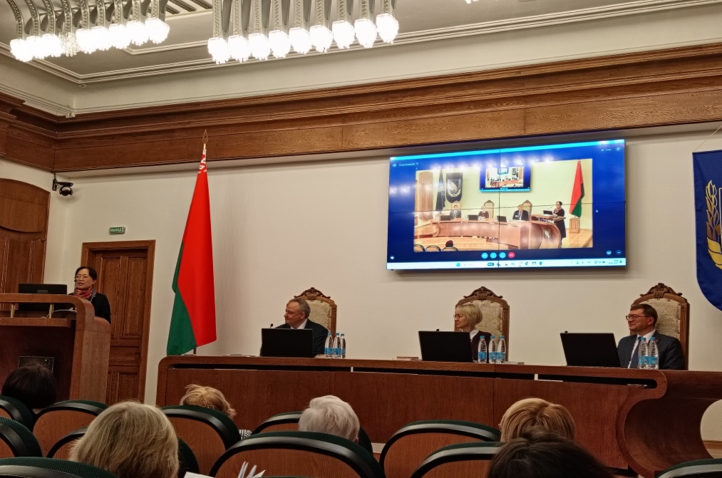 在白俄罗斯开会期间,周海燕还应俄罗斯友谊大学邀请参加了该校主办的国际学术实践研讨会,暨第七届菲尔索娃论坛,以视频方式做大会主旨报告,题目为“文化视角下俄语与汉语名词的代词化问题分析——以‘человек’和‘人家’为例”。