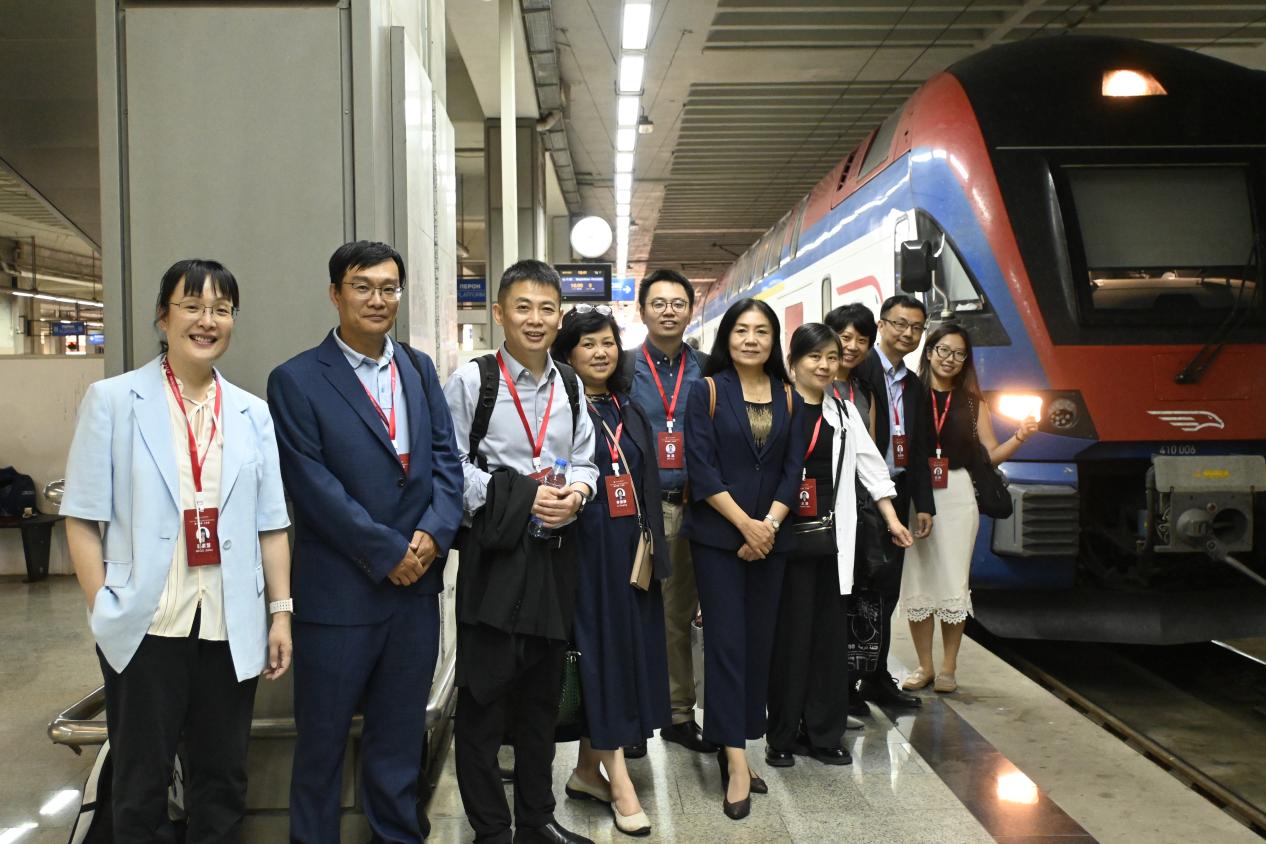 当日下午,调研团乘坐匈塞铁路列车前往塞尔维亚第二大城市诺维萨德,实地考察了中国铁路国际与中国交通建设集团联合承建的匈塞铁路项目部。项目负责人向调研团详细介绍了匈塞铁路塞尔维亚段建设进展、技术标准及运营规划,并分享了项目实施过程中在本地化合作、环保管理、法律适配、技术转移等方面的经验与挑战。调研团成员就中资企业在“一带一路”沿线基础设施建设中的作用、企业社会责任及本地人才培养等议题与项目团队展开讨论。
