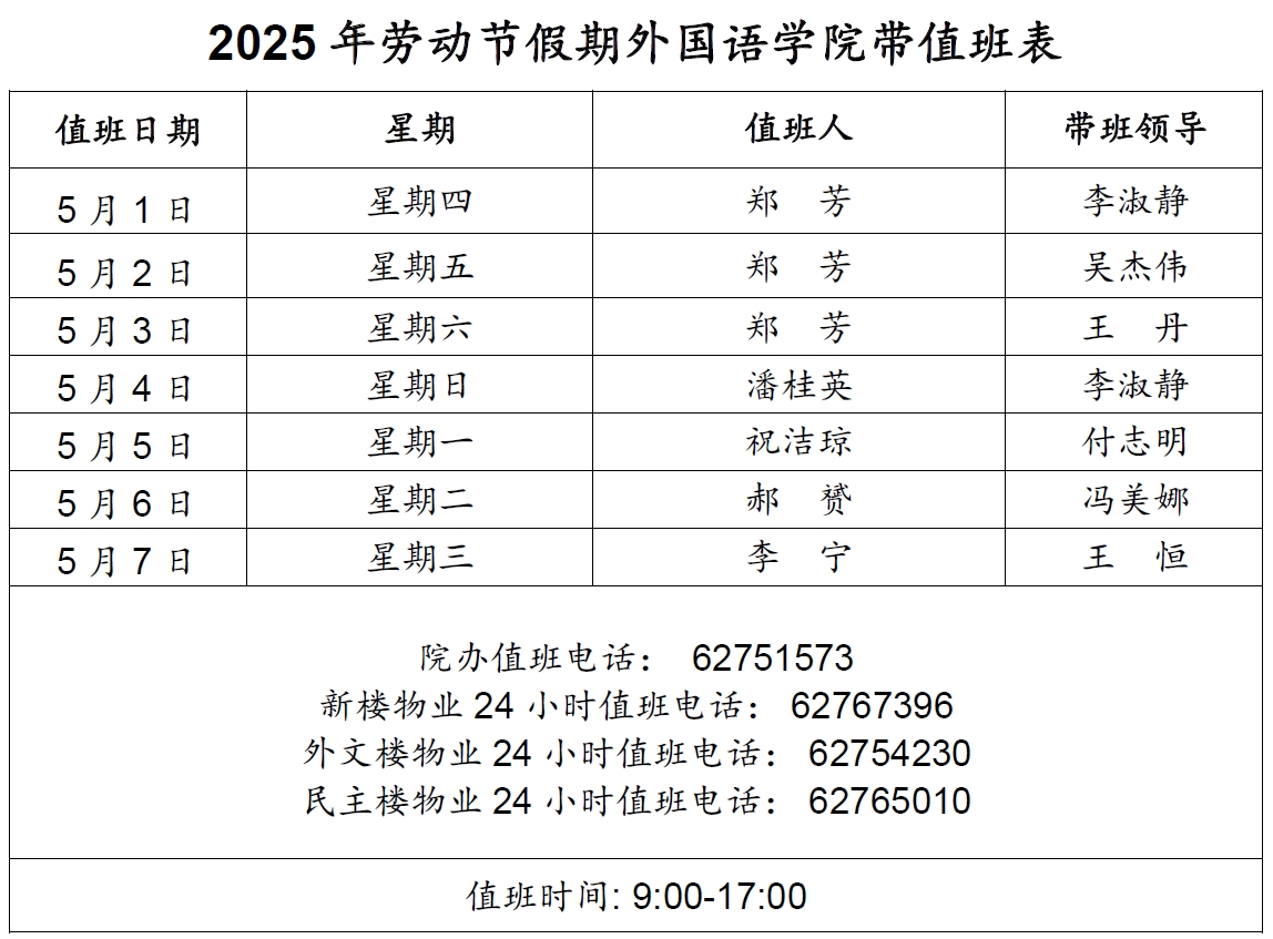 2025年劳动节假期华体网带值班表