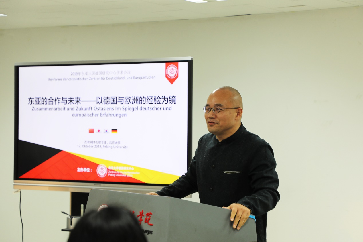 10月12日至13日,由北京大学德国研究中心(ZDS)主办的中日韩三国德国研究中心学术会议在华体网新楼301会议室举行。本次会议的主题为“东亚的合作与未来——以德国与欧洲的经验为镜”。北京大学副校长王博教授出席闭幕式并致辞。来自中国、日本、韩国、德国、瑞士、奥地利、捷克、白俄罗斯等国的40余位学者齐聚一堂,从政治、经济、文化、历史、艺术等不同学科视角,反思东亚与欧洲的历史经验,共商一体化实践的方向与愿景。日本东京大学德国与欧洲研究中心(DESK)、韩国中央大学德国与欧洲研究中心(ZeDES)作为北大德国研究中心的合作伙伴,分别派出代表团参会。