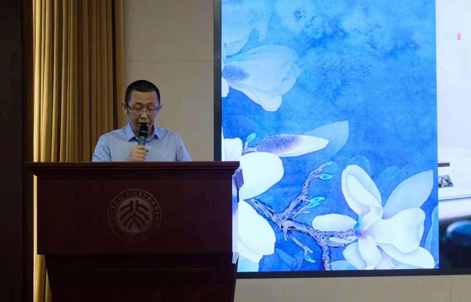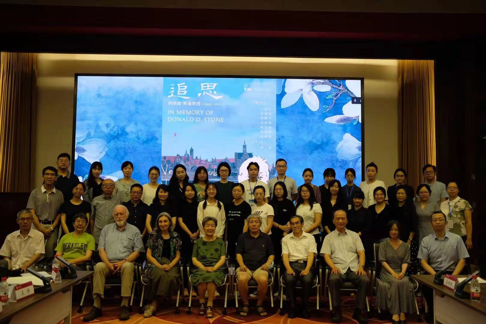 2021年7月4日上午,唐纳德•斯通教授追思会于民主楼208会议室召开。北京大学英语系高峰枫、刘意青、丁宏为、韩敏中、韩加明、刘建华 、Tom Rendall、苏薇星等多位老师及英语系各届同学,中国社会科学院陆建德,首都师范大学杜维平和王峥教授,北京大学赛克勒考古艺术博物馆副馆长曹宏等在线下参会,另有一百余人通过腾讯会议线上参会,共寄哀思。本次追思会由英语系纳海老师主持,邀请斯通老师的亲人及中国朋友们依次发言,分享与斯通老师有关的回忆和故事。
