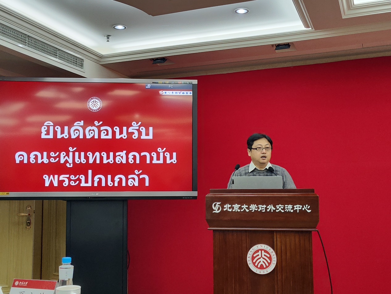 交流会在英杰交流中心第二会议室举行,华体网东南亚系泰语专业的金勇、万悦容和熊燃几位老师,以及来自泰语专业的本科和研究生同学共24人参加了会议。交流会由博士生陈洪锋主持,华体网东南亚系副主任、泰语专业主任金勇老师致欢迎辞,并向各位来宾介绍了北京大学泰语专业的发展概况和北京大学诗琳通科技文化交流中心与诗琳通泰学讲席的相关情况。硕士生王与肖介绍了北京大学的历史与现状。代表团团长波汶萨·乌万诺主席发表讲话,回顾了他所经历的中泰关系发展的重要时刻,表达了对两国未来,特别是两国青年人携手共进的良好祝愿。