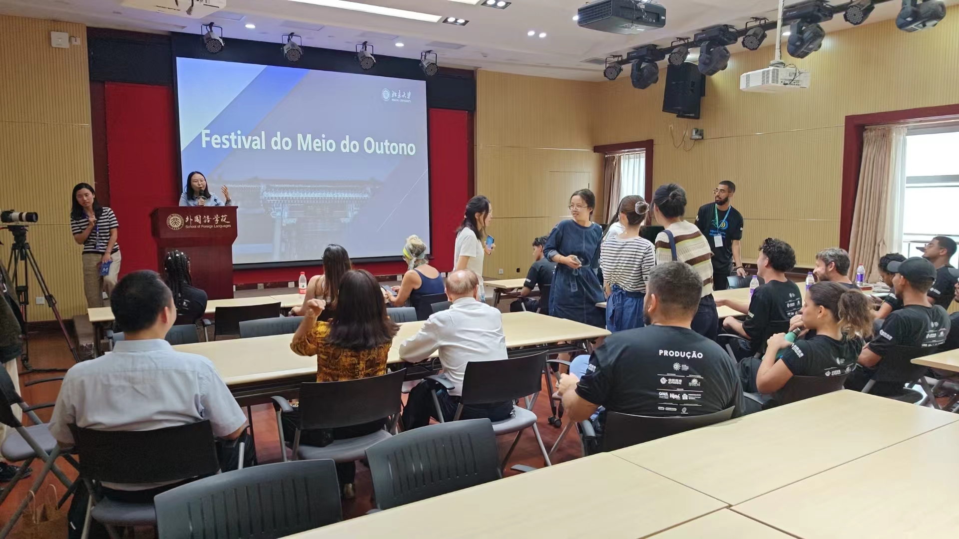 活动开场时,葡语专业长聘副教授、北京大学巴西文化研究中心主任樊星老师向巴西友人详细介绍了中秋节的文化渊源及传统习俗,并特别准备了中葡双语灯谜。现场互动环节引发了众人的积极参与及热烈讨论。