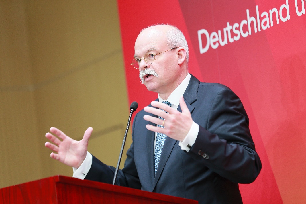 葛策首先回顾了中德两国在历史上源远流长的友好关系。他表示,改革开放后中德两国关系得到了迅速发展,合作潜力巨大,几十年来中德双边经贸往来频繁,中国已经连续第三年成为德国最大的贸易伙伴,德国也是中国在欧洲范围内最重要的贸易伙伴。面对国际范围内越来越多的不确定性因素,两国间的合作显得愈发重要,定期的双边高级别磋商、充满活力的贸易关系与合作、环境保护领域的合作以及文化、教育、科技方面的合作推动着双边关系不断深入发展。