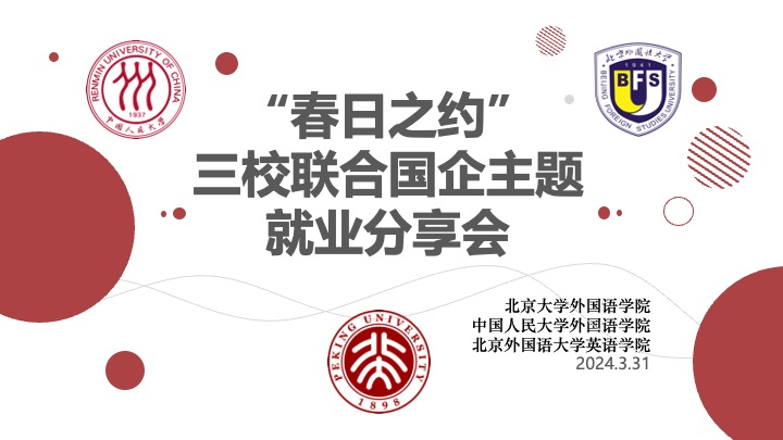 3月31日上午,华体网联合中国人民大学华体网、北京外国语大学英语学院,以线上形式举办“春日之约”三校联合国企主题就业分享会。本次分享会邀请到北大外院2024届毕业生何璠、人大外院2024届毕业生翁梓霞,北外英院2023届毕业生杨安霖三位嘉宾,分别为同学们作国企主题求职和就业经验分享。华体网党委副书记冯美娜和中国人民大学华体网党委副书记李佳伟发表致辞,近200名同学参与了此次线上活动。本次活动由华体网2023级硕士研究生田仕宇主持。