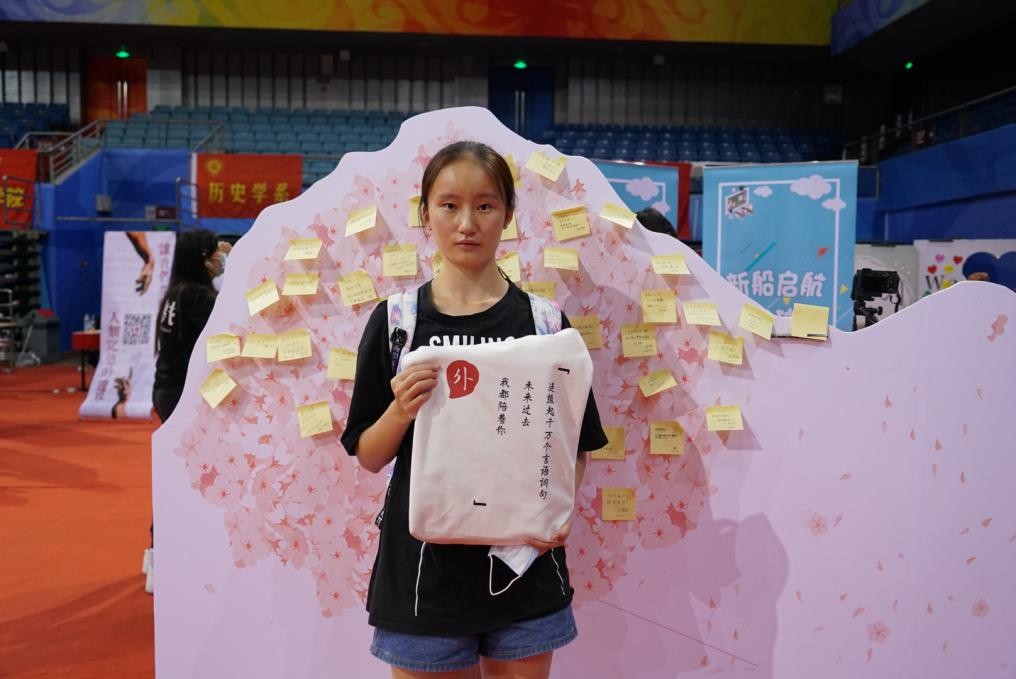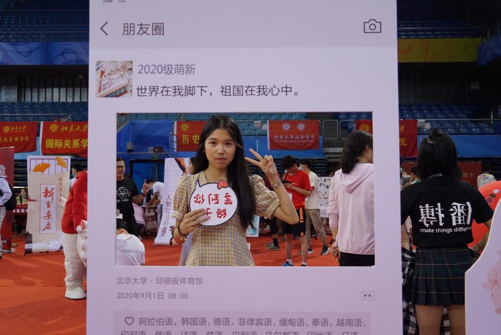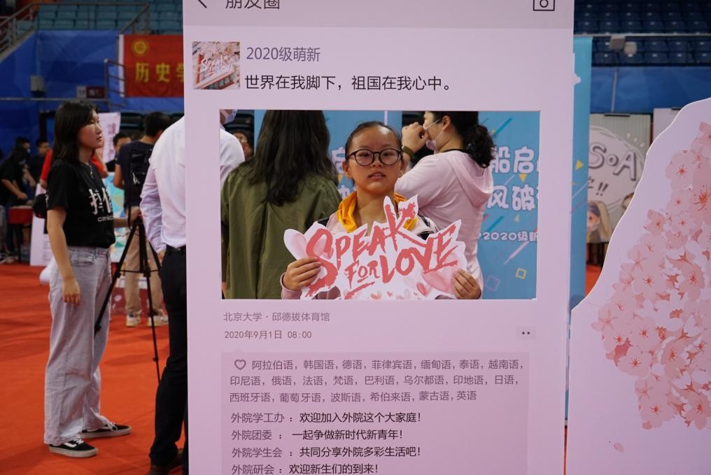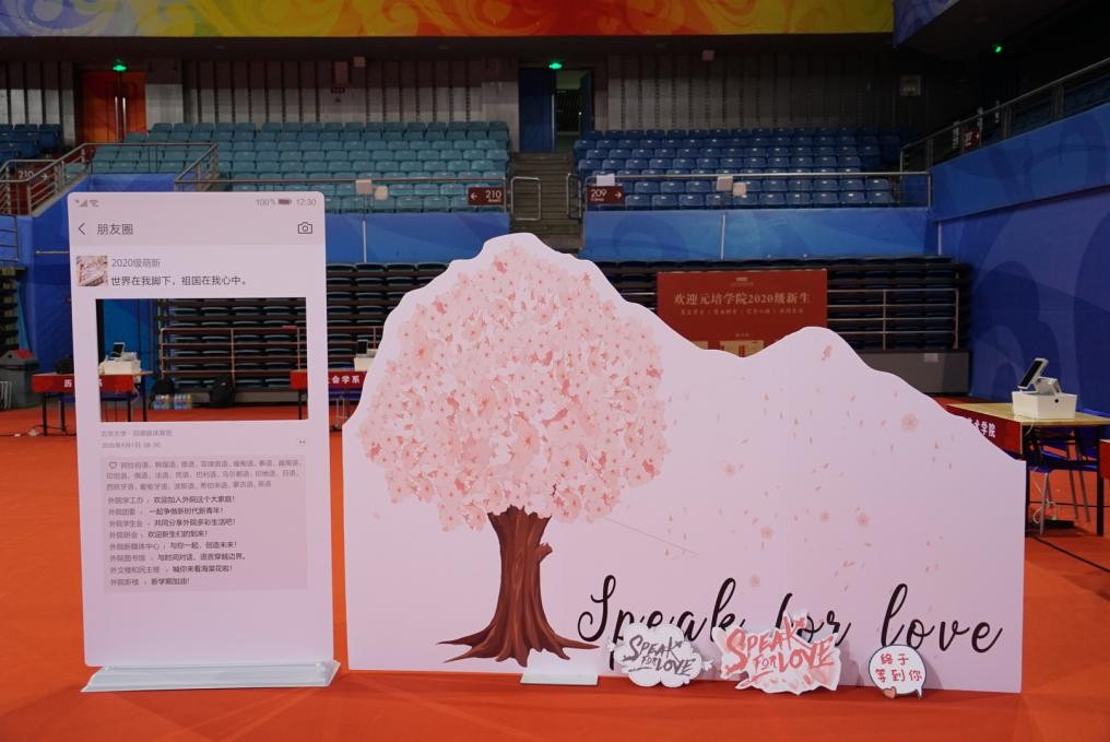 迎新接待站的外围,摆放着一棵象征着外院新生力量的“梦幻树”,上写有“speak for love”的外院人口号。新同学们纷纷在便签上写下自己初入外院的心情和对未来的期许,将之粘贴在“树”上,也将对未来的美好想象深植于心。之后,新生们在志愿者的引导下同外院“朋友圈”展板合影留念,他们手持着由学院精心制作的卡片,对着镜头绽开一张张略带稚气却无比可爱的笑颜。