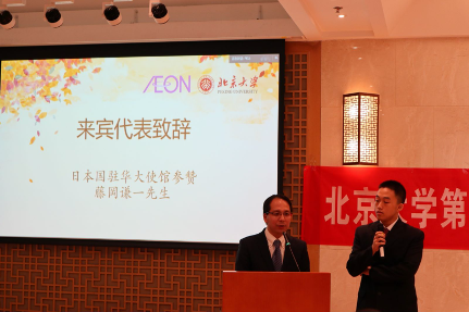 日本驻华大使馆参赞藤岡謙一先生发表致辞。他首先向筹备本次大赛的专家学者、评委老师、工作人员表示感谢,肯定了选手们在即兴演讲环节的表现,高度赞扬了北京大学在人才培养中的突出成绩。他强调,语言是交流的工具,通过语言理解他人、传达思想是非常重要的。藤岡謙一先生还对选手们寄予厚望,希望选手们能够成为中日文化交流的友好使者,利用语言技能为中日两国文化事业做出贡献。