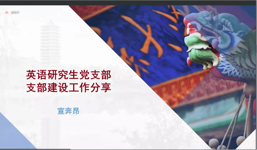 英语研究生党支部曾获得北京大学学生党团日联合主题教育活动一等奖和二等奖,北京大学百堂精品学生党课等荣誉。党支书宣奔昂同学围绕基本情况、工作机制、综合模式与实践服务四个板块分享了党支部的建设经验。支部党员发展情况良好,积极开展党建活动,严格落实“三会一课”制度,宣传工作实时推进。采取“理论+学术+实践+体育+美育”综合性基层党建模式,积极开展思政实践活动,打造品牌活动和样板支部,让更多党员有参与感、融入感、归属感。