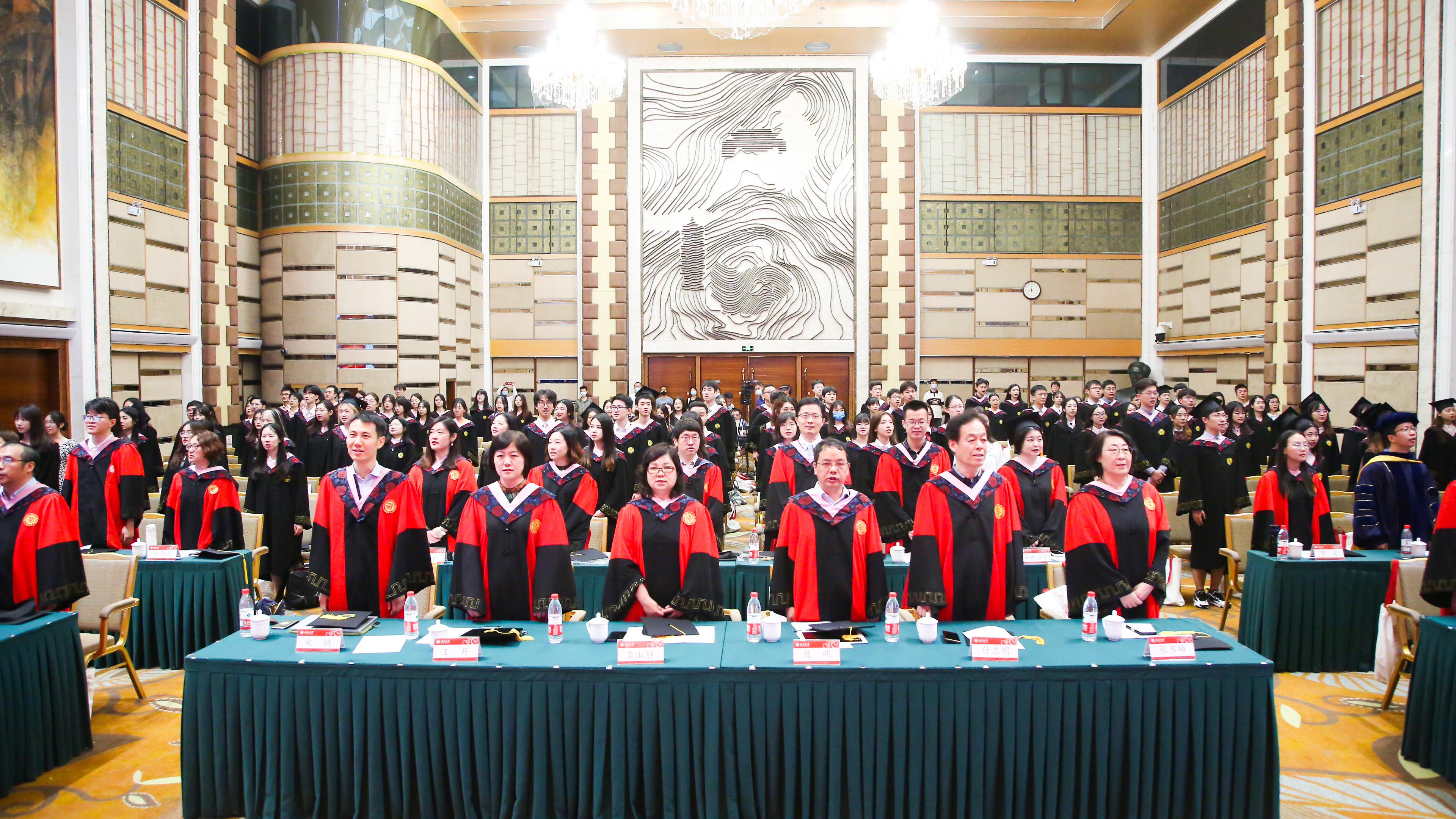 典礼行将结束,全体师生起立合唱《燕园情》。“燕园情,千千结”,连接的是所有外院人的心,不变的是永恒炽热的师生情和同学情。“眼底未名水,胸中黄河月”,荡漾的是北大外院学子的爱国之情,照亮的是奔赴广阔天地的奋斗之路。毕业生们用歌声作别,唱出了对彼此对师长的感激,唱出了对北大和外院的不舍,也唱出了建设新时代,踏上新征程的壮志豪情。