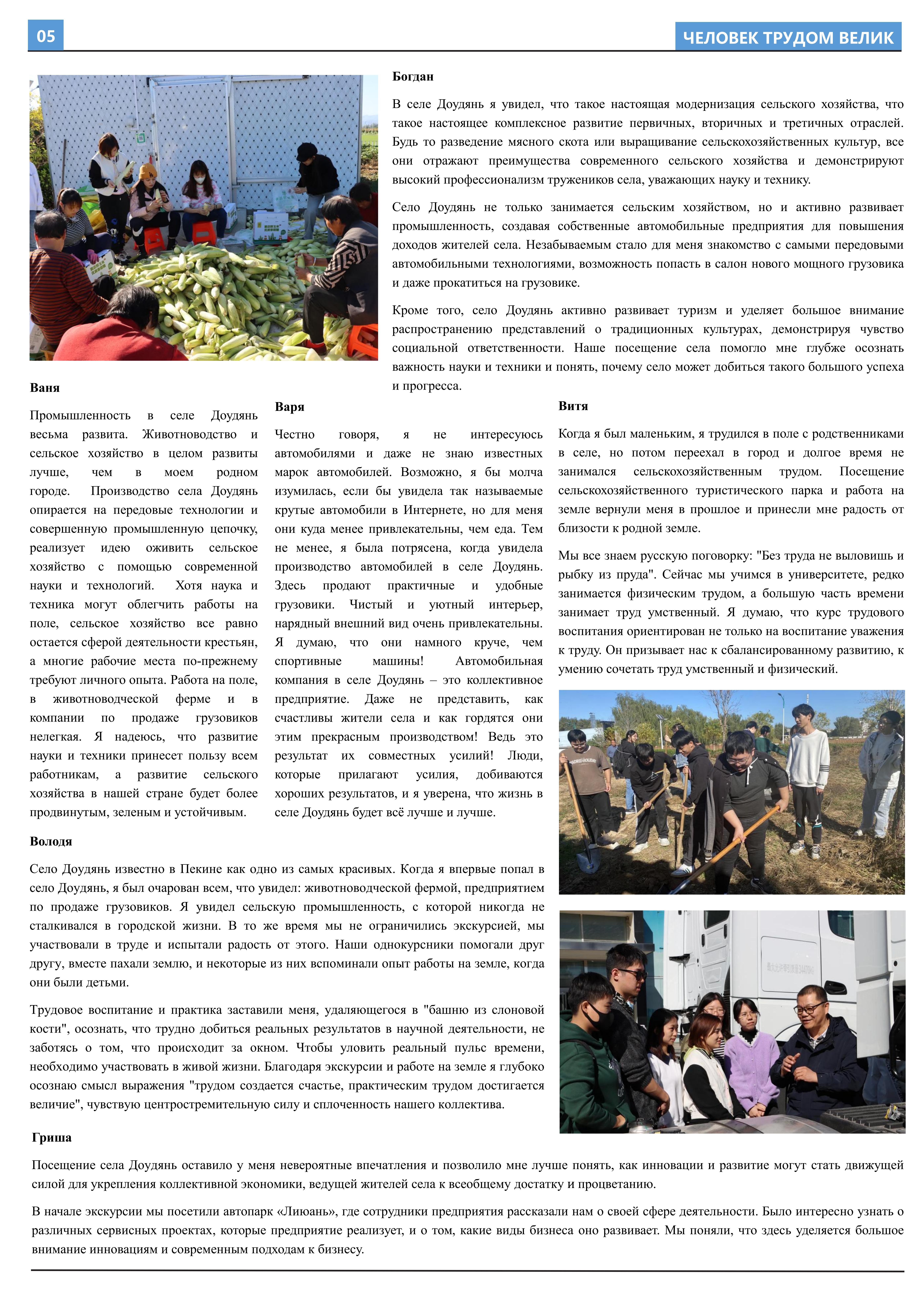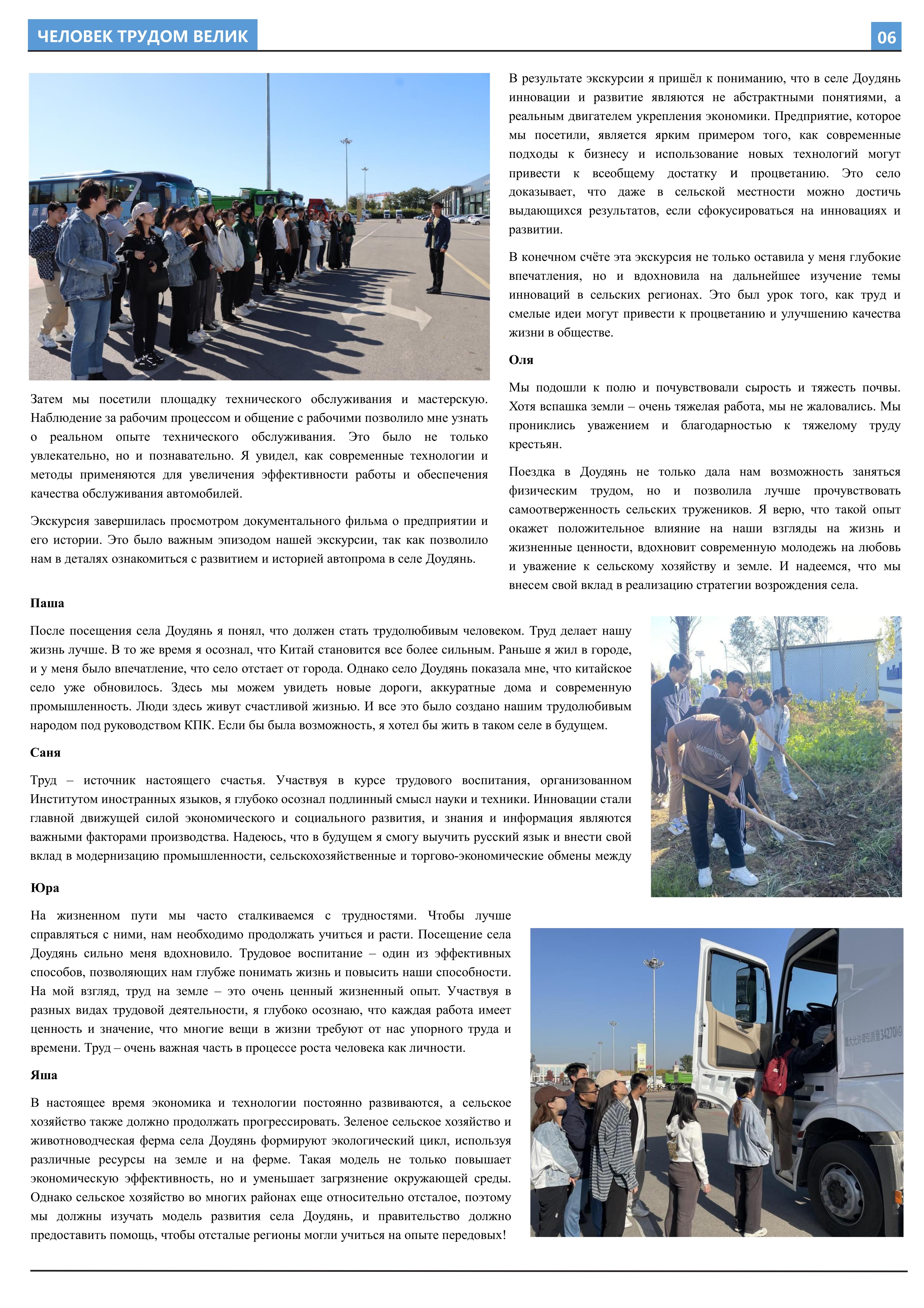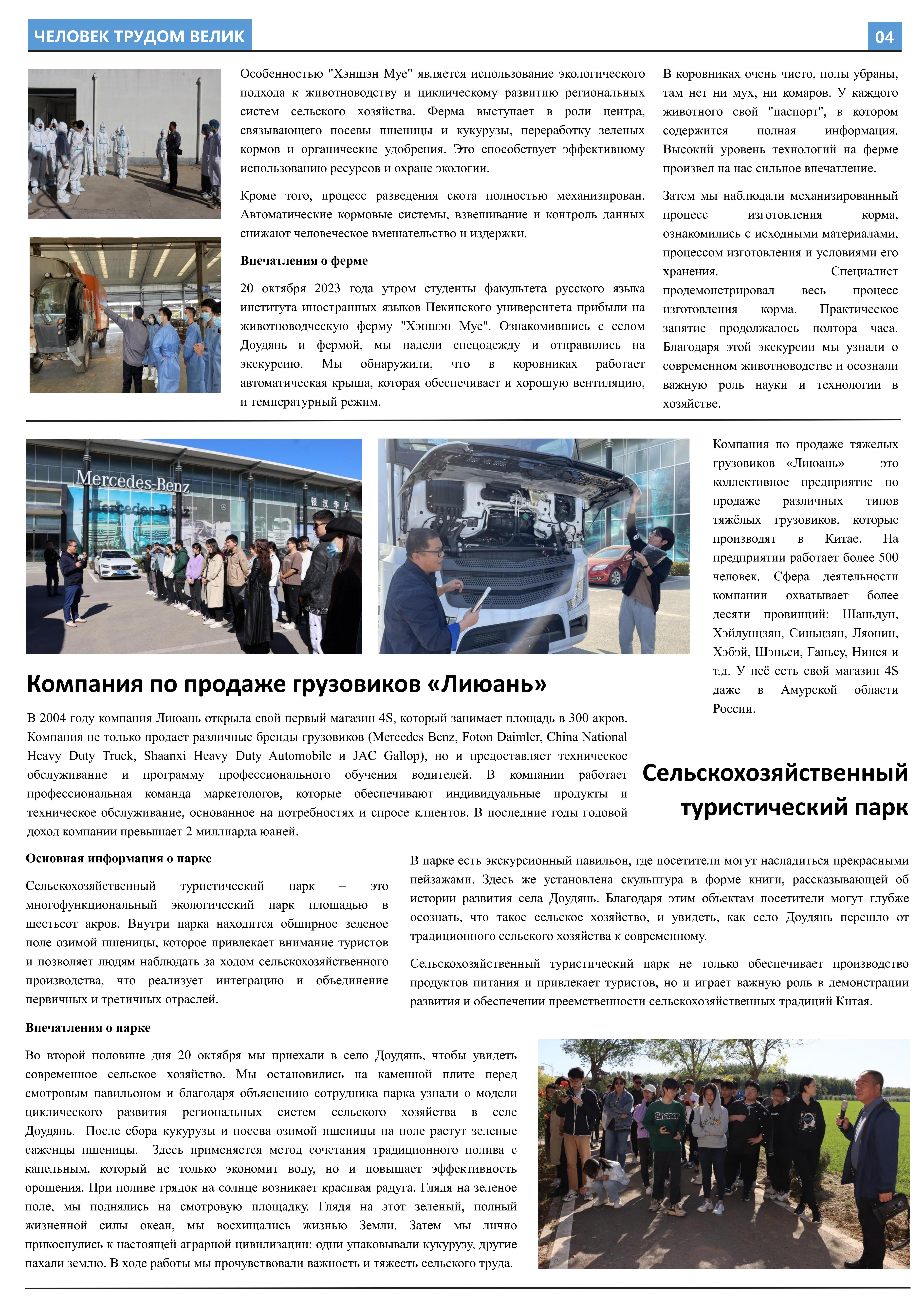 在接受劳动教育、参与劳动实践后,2023年10月至2023年12月,华体网2021级俄语本科生班的11名同学立足于学院平台和专业课堂(《俄语报刊阅读(上)》与《俄语写作(上)》),在两位课程主讲教师王帅和外教叶莲娜·马尔卡索娃(Елена Маркасова)的指导下,通过线上分工、小组讨论等形式商讨报纸细节,并学习使用重要概念和关键词句的俄语表达,历时近三个月,共同完成6个版面、3000余个单词数的“劳动成就人——关于劳动教育”主题报纸。报纸共分为8个大主题、13个小主题,全面介绍了华体网劳动教育课程的实施背景及学生参与情况,系统阐述了窦店村的历史文化与经济发展等多方面内容,并详细记录了同学们在窦店村恒升牧业畜牧养殖中心、窦店利元车业、农业观光园等劳动教学点的劳动实践与参访感受。