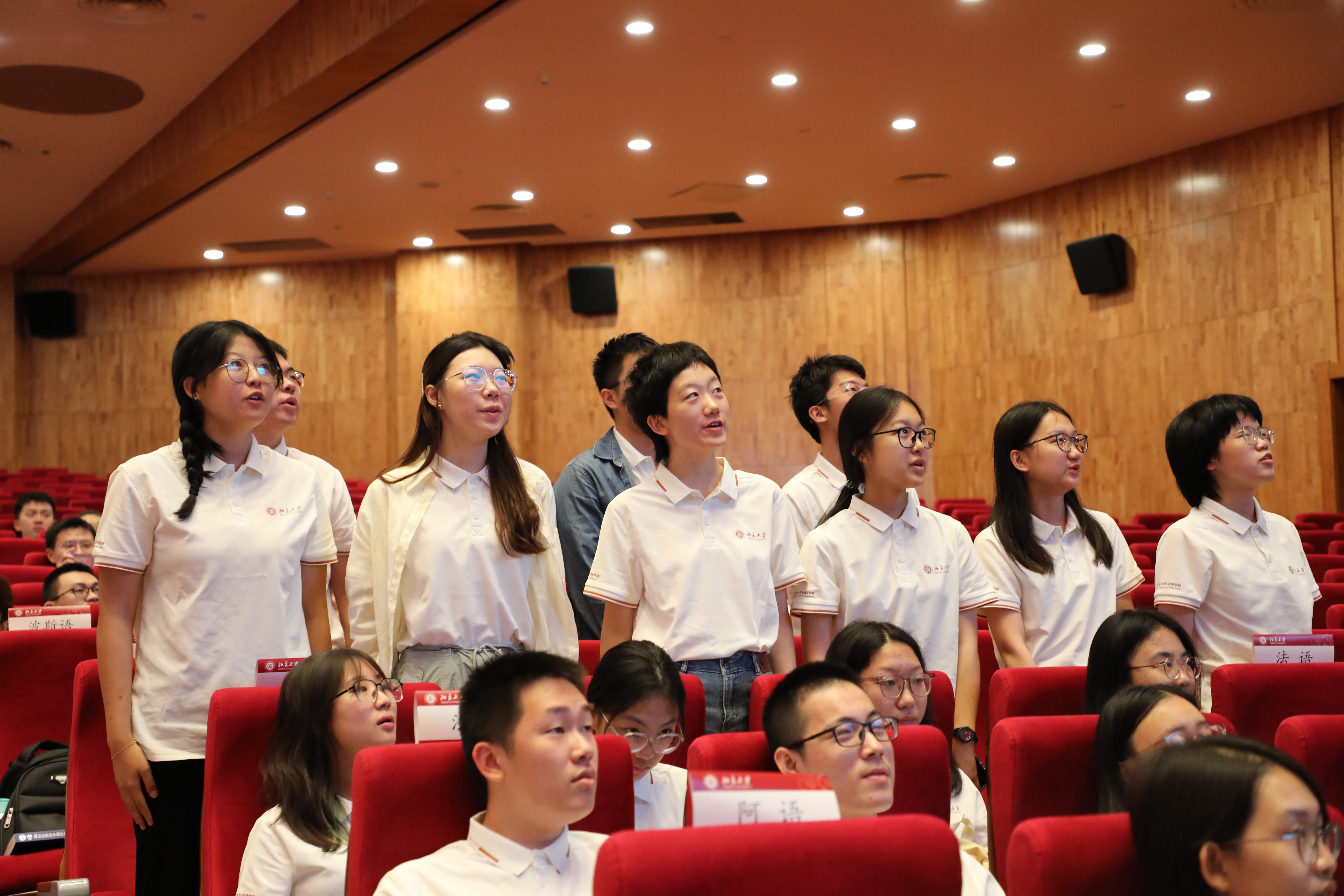 作为开学典礼的特别环节,本科各班新生展示了别具特色的班级口号。“彬彬济济,律己为翼,菲向广阔天地!”“Молодые русисты, вперёд!(年轻的俄语系人向前进!)” “百年德语,三代赓续,今朝看我,沉潜坚卓”“……观众厅内,新生们高喊口号,表达着对专业学习的热爱;掌声不断,透露出对未来生活的期待;欢呼声此起彼伏,展现出蓬勃的青春力量。