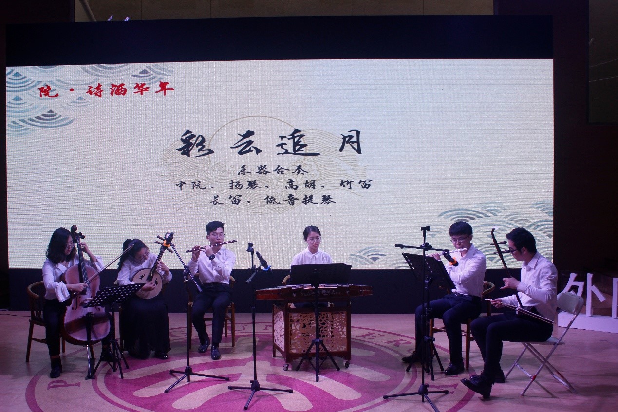 “院·诗酒华年”板块,张甲民老师和张江龙同学诵读《再见吧,北京》,缅怀已故诗人对北京、对燕园的一腔赤诚;弹唱朗诵《当你老了》向前辈致敬,感谢老一辈外院人将青春与汗水播撒在这一方土壤,浇灌出外文楼前的繁花似锦,也浇灌出北大外院的桃李芬芳。