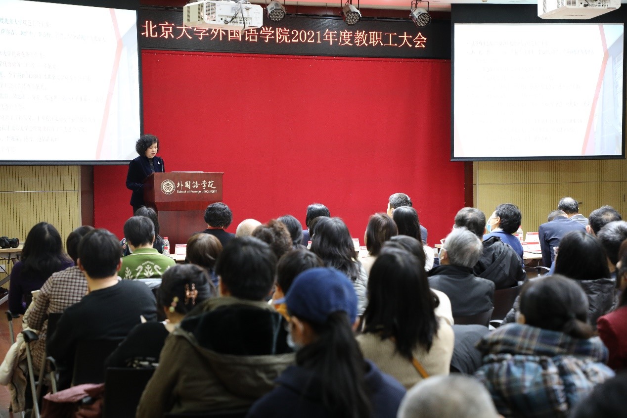 随后,李淑静代表学院党政班子向与会教师致新年贺辞。李淑静回顾了2021年外院取得的诸多成绩:学院师生在各类评比中屡创佳绩,特别是在前一天,第二批“全国高校黄大年式教师团队”名单公示,段晴教授带领的东方语言文化教师团队入选,极大地鼓舞了全院师生。外院精心培育具有前瞻性的科研项目,2021年获省部级以上科研项目13项。外院本科专业不断壮大,截止目前已入选国家级一流本科专业建设点19个,入选省级一流本科专业建设点2个。本年度外院本科教学、研究生教学、科研绩效、综合管理绩效评估均为A+,学院党委被评为北京大学先进党组织……2021年,8位教职工从工作岗位上荣休, 11位新同事加入外院大家庭。2022年,学院将迎来9位90岁寿星,3位80岁寿星。正值2021年最后一天,愿全体外院人在新的一年里继续携手并肩,昂首向前。