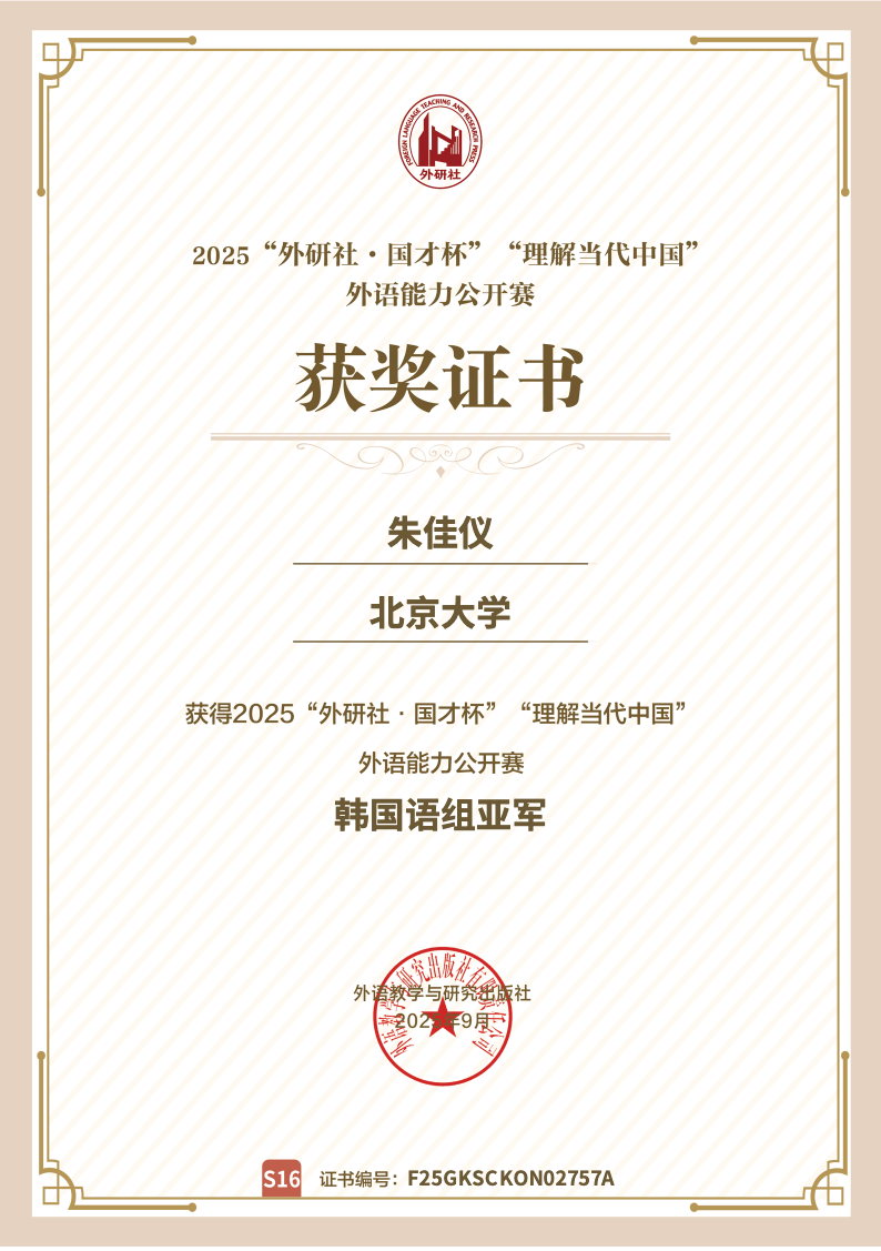 2025年9月5日,2025“外研社·国才杯”“理解当代中国”外语能力公开赛(多语种组)顺利举行。学院朝(韩)语系2022级本科生朱佳仪同学在韩国语组比赛中表现优异,荣获全国亚军。