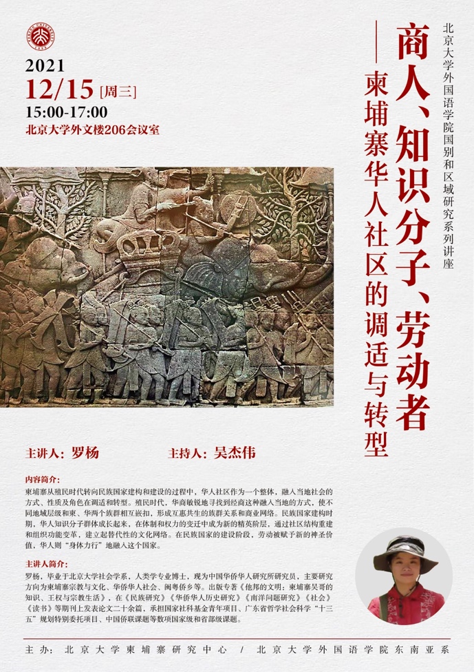 2021年12月15日,北京大学柬埔寨研究中心邀请中国华侨华人研究所罗杨研究员做了题为“商人、知识分子、劳动者——柬埔寨华人社区的调适与转型”的讲座。本期讲座由北京大学柬埔寨研究中心、华体网东南亚系、国别和区域研究专业联合主办。华体网吴杰伟、谢侃侃老师和20多名学生参加了本次讲座。