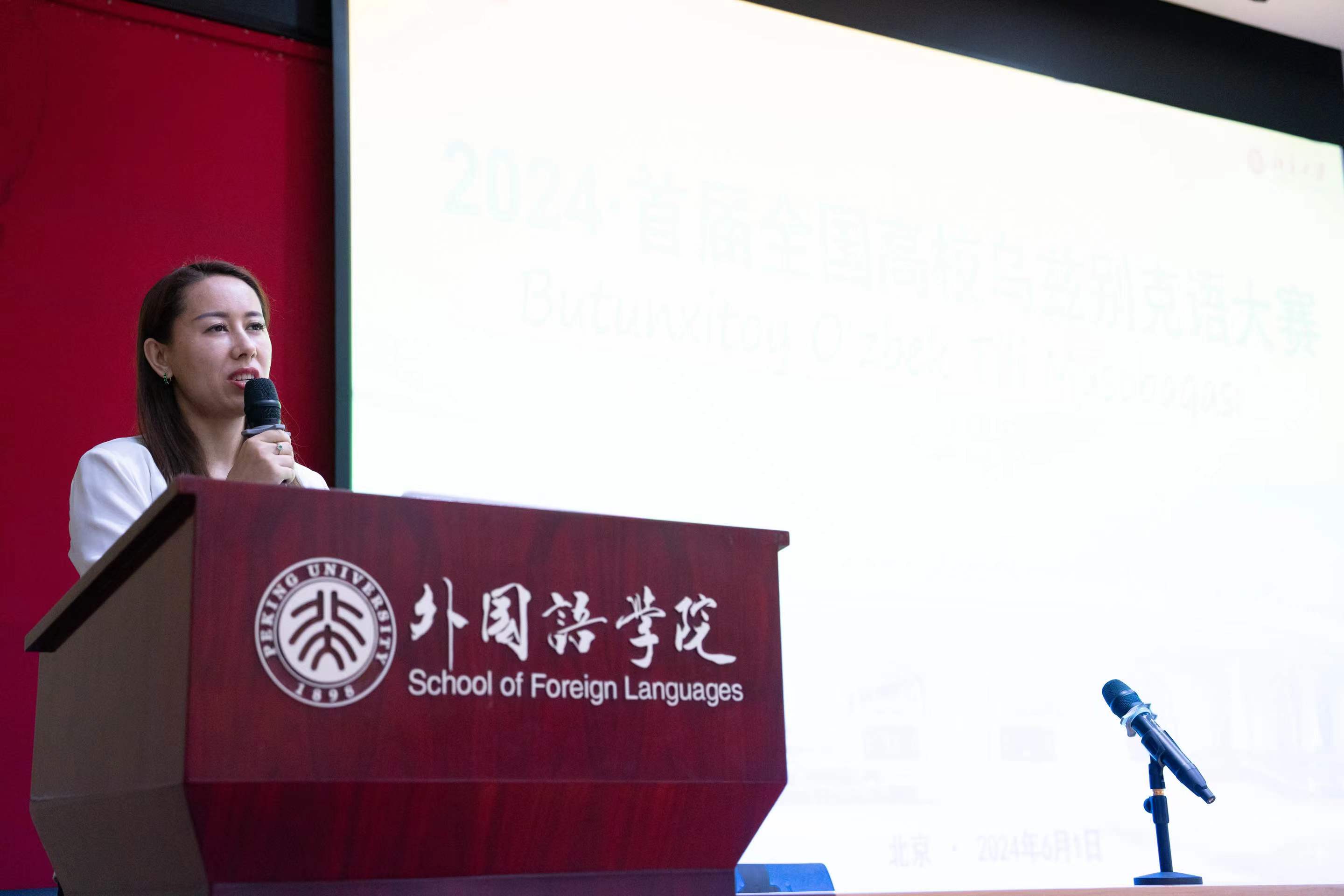 古丽巴努木副院长回顾了中央民族大学华体网俄语-中亚语系的成立、建设和发展壮大的过程。她强调,在"一带一路"倡议所带来的历史机遇下,教授和学习包括乌兹别克语在内的中亚语言为我们打开了一扇认识世界的新窗口。2022年,中央民族大学和北京大学在培养乌兹别克语人才合作交流中碰撞出火花。展望未来,她满怀期待地表示,希望两校能够在更多领域深化合作,共同培养出更多优秀人才。她相信,通过两校的共同努力,一定能够为中乌文化交流和"一带一路"建设贡献更多的智慧和力量。古丽巴努木副院长向所有参赛的同学们表达了美好的祝愿,期待他们取得优异的成绩。