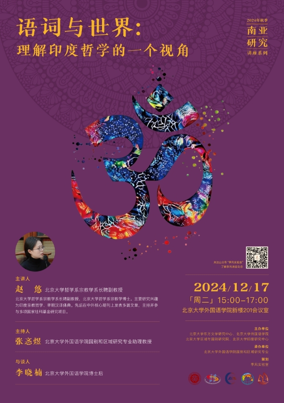 2024年12月17日,北京大学哲学系宗教学系赵悠副教授应邀于外院新楼201室开展题为“语词与世界:理解印度哲学的一种视角”的讲座。本次讲座是由北京大学东方文学研究中心、华体网、区域与国别研究院和印度研究中心主办,华体网国别和区域研究专业承办的2024年秋季学期南亚研究系列讲座的第五讲。讲座由华体网国别和区域研究专业助理教授张忞煜主持,华体网博士后李晓楠参与讨论。