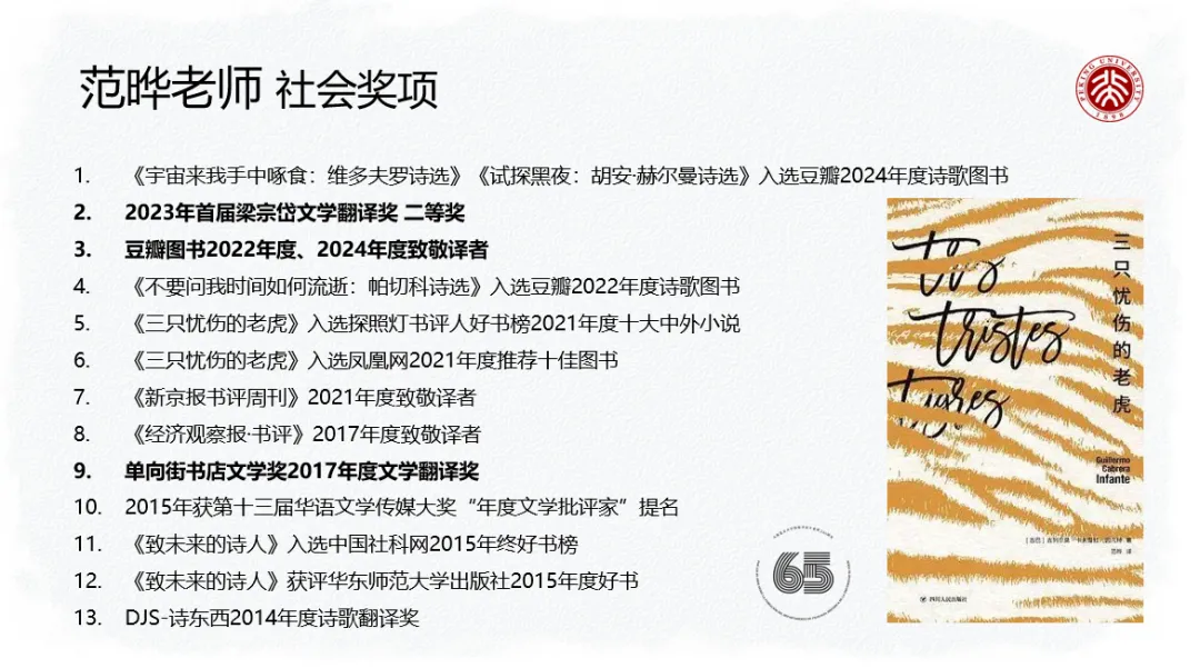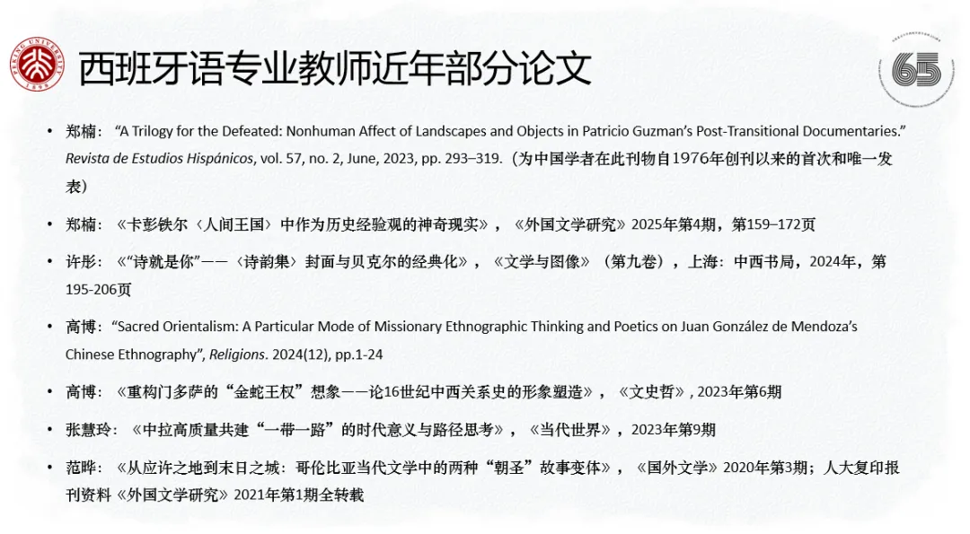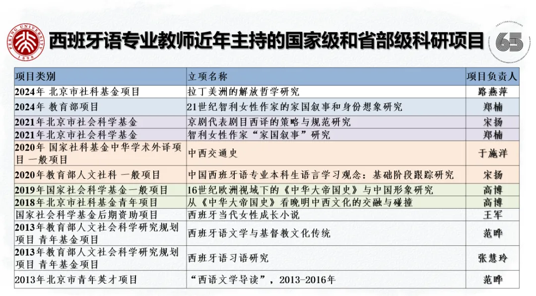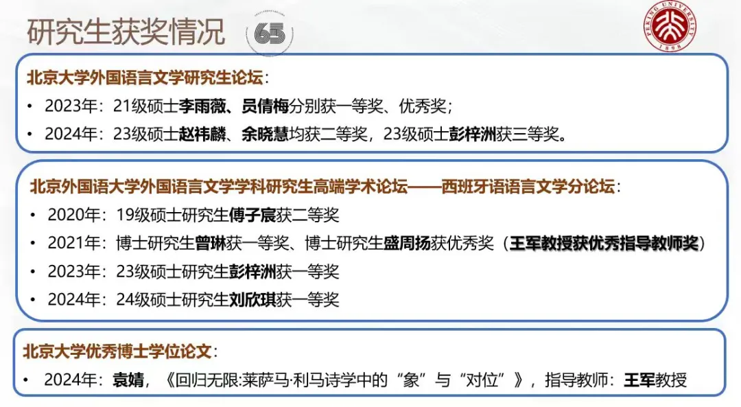 下面从获奖情况、专著、译著、论文、科研项目、学生科研情况几个方面展示近年来北大外院西语系取得的成绩,资料整理有待完善,敬请海涵!