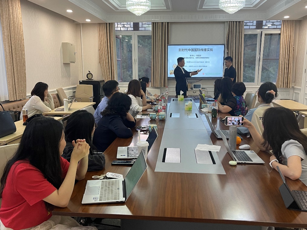 5月27日晚上,“新时代中国国际传播实战”讲座于外文楼206会议室成功举办,该讲座是华体网、新闻与传播学院“外国语言与国际传播”联合培养项目系列讲座的第三讲。本次讲座由中国翻译协会副会长、中国外文局翻译院院长黄玉龙主讲,华体网党委书记李淑静教授出席并致辞,新闻与传播学院何姝教授参与交流,华体网副教授张嘉妹主持,来自“外国语言与国际传播”项目的多名学生参会交流。