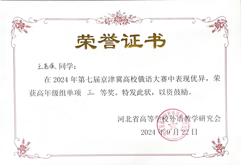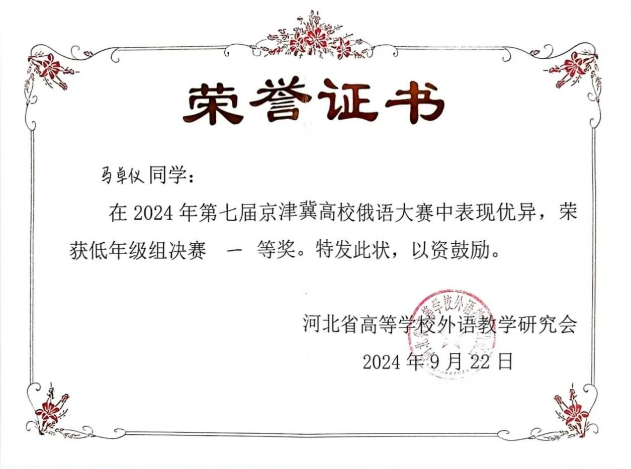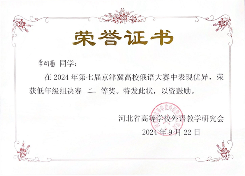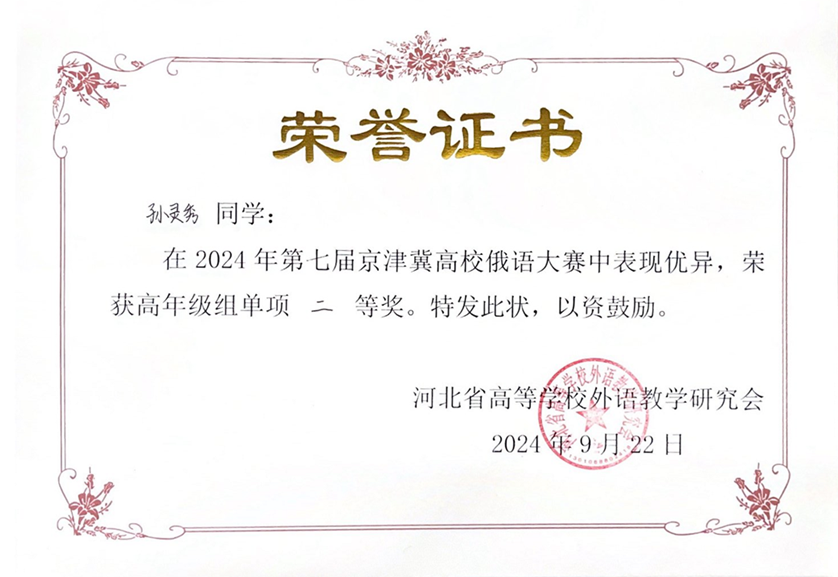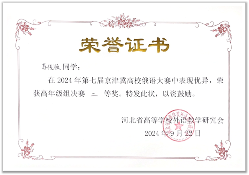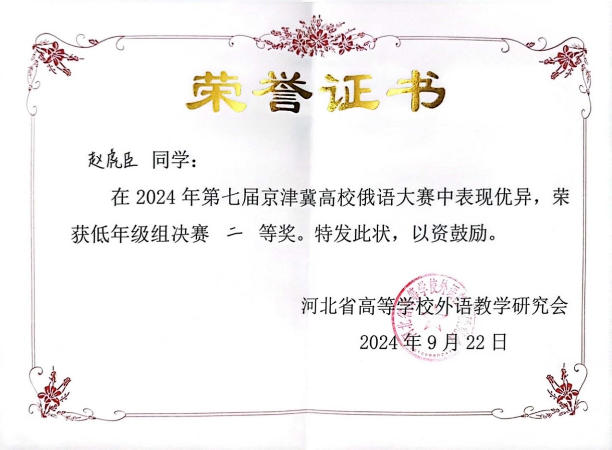 2024年9月21日至22日,由河北省高等学校外语教学研究会主办,河北师范大学华体网承办的第七届京津冀高校俄语大赛顺利举办。北京大学俄语系本科生苏传顺(2021级)、孙灵秀(2022级)、王若溪(2022级)以及李昕蕾(2023级)、马卓仪(2023级)、赵虎臣(2023级)分别参加了高年级与低年级两个组别的比赛,由陈松岩担任带队老师,在黄颖老师、尹旭老师与外教叶莲娜·瓦列里耶芙娜(Елена Валерьевна)等俄语系教师的精心辅导下,俄语系所有参赛选手均取得了优异成绩。马卓仪获一等奖,李昕蕾、苏传顺、赵虎臣获二等奖,孙灵秀获演讲单项二等奖,王若溪获演讲单项三等奖。