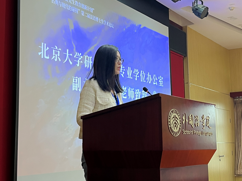 北京大学研究生院专业学位办公室副主任李爽老师作为嘉宾致辞。李爽老师指出,研究生教育创新计划自2009年起在北京大学启动,支持举办博士生学术论坛、学术会议以及暑期学校等学术交流活动,旨在为研究生成长成才构建多学科、开放型、全方位的培养平台。作为本年度研究生创新计划重点资助的项目,本次博士生学术论坛将为法语文学研究者展开思想对话、进行学术交流提供宝贵的机会。