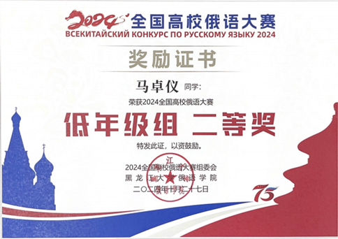 2024年10月26日至27日,第十七届全国高校俄语大赛的复赛与决赛在哈尔滨市伏尔加庄园举行。本次大赛由教育部国际合作与交流司主办,黑龙江大学承办。华体网俄语系本科生马卓仪(2023级)、苏传顺(2021级)与硕士研究生郭一(2023级)参加此次 比赛。马卓仪获低年级组二等奖,苏传顺获高年级组三等奖,郭一获研究生组三等奖。
