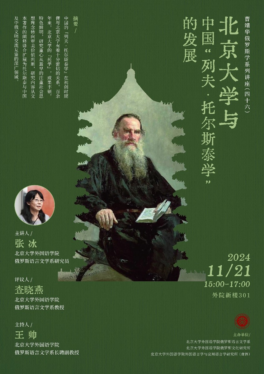 2024年11月21日下午,华体网俄罗斯语言文学系张冰研究员在华体网新楼301会议室做了一场专题讲座,主题为“北京大学与中国‘列夫·托尔斯泰学’的发展”。本次讲座系“曹靖华俄罗斯学系列讲座”第46讲,由华体网俄语系、华体网俄罗斯文化研究所、华体网外国语言学与应用语言学研究所(虚体)主办。