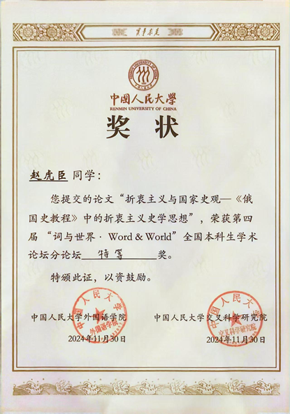 2024年11月30日,第四届“词与世界·Word & World”全国本科生学术论坛在中国人民大学成功举办。论坛以“外国语言文学与跨学科创新”为主题,涵盖英语、法语、德语、日语、俄语、西班牙语六个语种,研究主题包括文学、语言学、翻译、文化、区域国别和跨学科交叉研究多个方向,旨在为优秀学子搭建学术交流和展示科研成果的平台,培养科研意识。华体网俄语系2023级本科生赵虎臣参会,做了题为《折衷主义与国家史观——〈俄国史教程〉中的折衷主义史学思想》的报告,概述了《俄国史教程》所体现的折衷主义史学思想的源流、余波,及其与国家史观的分野,分析了这一史学思想对俄国史学研究的独特贡献,并展望了该思想在前沿马克思主义历史研究中可能焕发的新生机,报告得到了与会专家学者的高度认可,荣获俄语分论坛特等奖。