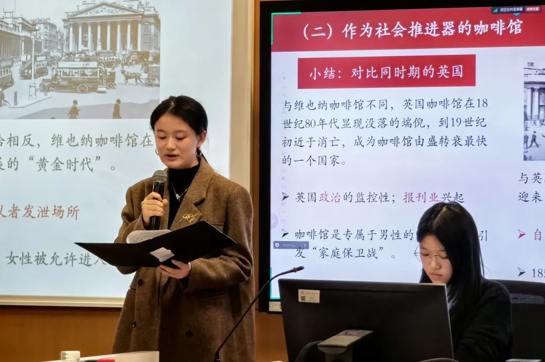 王子璇、张瀚文的研究,脱胎于两位同学自2024年8月起跟随林老师进行的主题为“维也纳咖啡馆与公共空间”的本科生科研训练。该研究论文聚焦于19、20世纪之交的“世纪末(Fin-de-siècle)”时期,以维也纳咖啡馆的发展史为切入口,从维也纳现代派作家霍夫曼斯塔尔《俄狄浦斯与斯芬克司》《钟楼》等剧作、施尼茨勒的长篇小说《通向自由之路》与茨威格的自传体回忆录《昨日的世界》等经典文学文本,以及卡尔·休斯克的欧洲思想史领域经典著作《世纪末的维也纳》、美国文学文化学者席格尔《维也纳咖啡馆的才子们:1890-1938》等研究性文本出发,挖掘了作为“社会推进器”的咖啡馆在推动阶层变化、催生衍生经济、促进市民生活多元化等领域的社会功能,以及作为“思想集散地”的咖啡馆以其开放的公共空间特性,在大学体系之外的文艺、政治思想交流、发展与实践中作为信息来源、批判场域的重要作用。最终,两位同学凭借优异的表现,荣获“德语语言文学与跨学科创新研究”分论坛唯一特等奖。