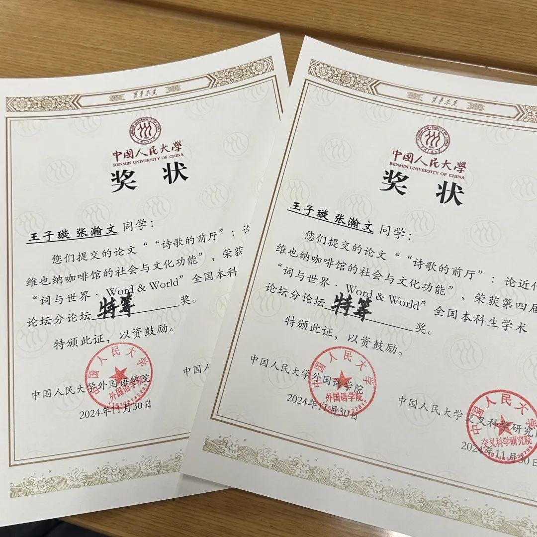 2024年11月30日,由中国人民大学华体网、交叉科学研究院主办的第四届“词与世界”全国本科生学术论坛顺利落幕。本届论坛以“外国语言文学与跨学科创新”为主题,涵盖英语、法语、德语、日语、俄语、西班牙语六个语种,面向全国高校本科生征稿。华体网德语系2023级本科生王子璇、张瀚文在德语系林琳老师的指导下,完成了以《‘诗歌的前厅’:论近代维也纳咖啡馆的社会与文化功能》为题的研究,在论坛宣读报告,最终荣获分论坛特等奖的殊荣。