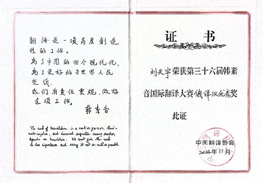 刘天宇同学:韩素音女士曾说过:“翻译是一项高度创造性的工作。”翻译是文化沟通的纽带,而译者是文明的驿马。今后我将继续提升翻译水平,以期获得更好的成绩,并为中俄文化的交流与沟通贡献自己的绵薄之力。
