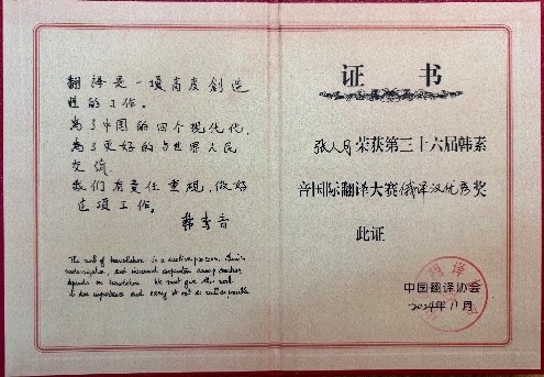 张人月同学:参加韩素音翻译大赛让我有机会深入体验翻译的魅力和挑战。在转换语言的过程中,不只是词句的简单替换,还需要理解背后的文化内涵和语境。这让我意识到翻译不仅是技能,更是一种细腻的思维训练。获奖是对自己努力的肯定,也让我看到更多提升的空间。