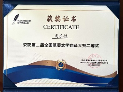 尚乐敏同学:非常荣幸能够在本次全国草婴文学翻译大赛中获得二等奖,感谢大赛评委们的肯定和学院老师们的鼓励。本次参赛既令我享受到文学翻译字斟句酌的乐趣,也鼓励我继续在自己热爱的翻译领域深入探索。