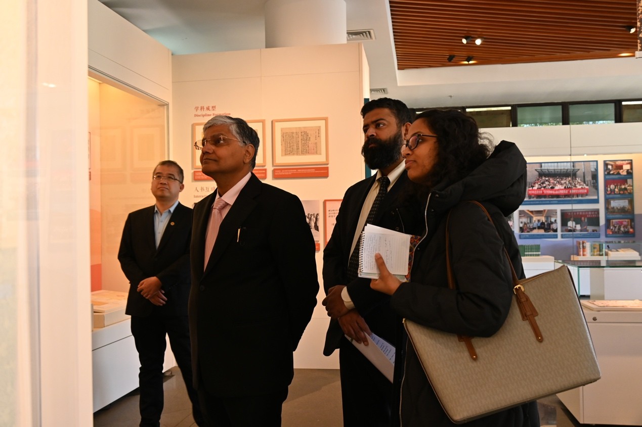 会见后,罗国栋一行移步至北京大学校史馆,在北京大学档案馆、校史馆馆长余浚陪同下,参观“百年回眸:北大的印度学学科建设与中印人文交流展”,华体网南亚学系博士生郭家誉为嘉宾详细导览。展览通过珍贵文献、历史照片及学术成果,系统梳理了北京大学印度学学科百年发展历程,展示了历代北大学者在印度宗教、哲学、文学、图像学、语言教学等领域的丰硕成果。北大的印度学科不仅是中国早期东方学的重要组成部分,也为中国东方学学科的建设和发展树立了标杆,并将继续为新时代的印度学学科建设发挥关键作用。观展结束后,罗国栋为北京大学校史馆写下亲笔留言,并与接待嘉宾合影留念。